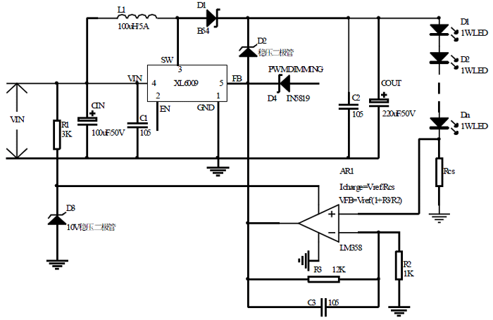 XL6009是一个400KHz的固定频率PWM降压DC-DC转换器,4A开关电流能力,该电路应用简单,外部元器件比较少。鉴于LED领域的系统需求,内部除了常规的
